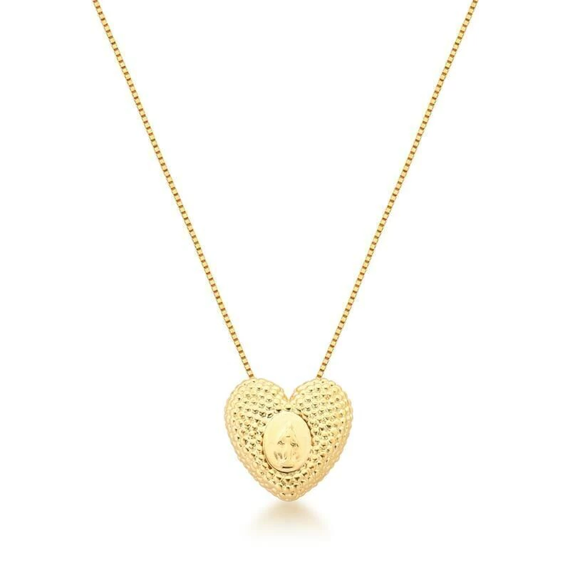 A corrente em malha veneziana apresenta um pingente de coração que é um verdadeiro símbolo de amor e fé, complementado por Nossa Senhora das Graças, tanto em versão trabalhada quanto lisa.